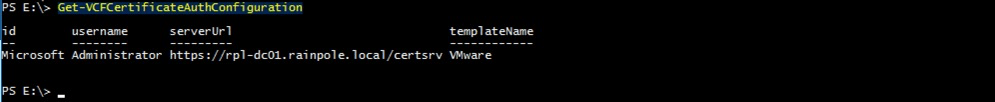 We can then verify the configuration using the Get-VCFCertificateAuthConfiguration cmdlet. Enter the following syntax.