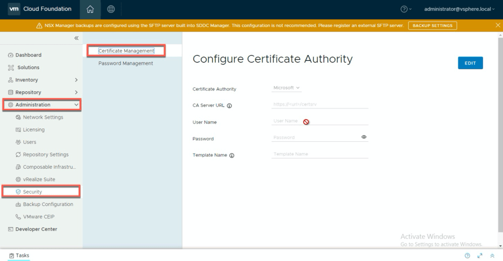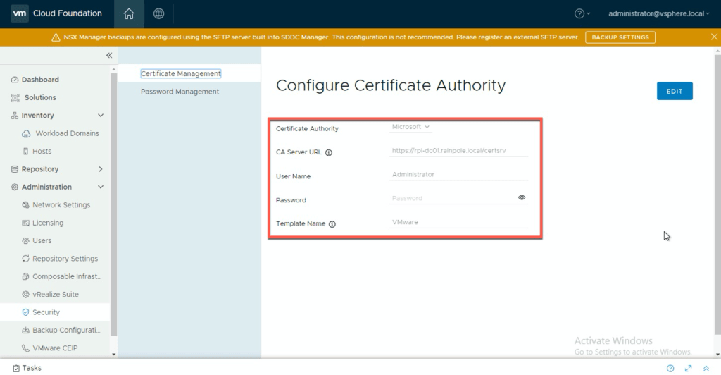 Connect SDDC Manager to the Microsoft Certificate Authority using the User Interface