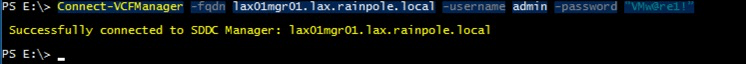 Connect-VCFManager -fqdn lax01mgr01.lax.rainpole.local -username admin -password "VMw@re1!"