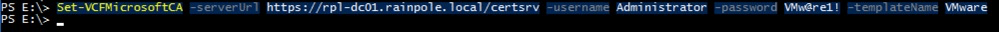Set-VCFMicrosoftCA -serverUrl https://rpl-dc01.rainpole.local/certsrv -username Administrator -password VMw@re1! -templateName VMware