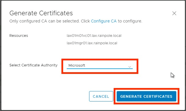 • In the Generate Certificates dialog, using the Select Certificate Authority dropdown and select Microsoft, then click Generate Certificates.
