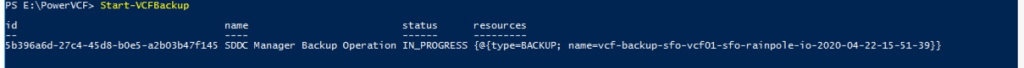 2. Trigger a backup using the PowerVCF cmdlet Start-VCFBackup. Enter the following command: