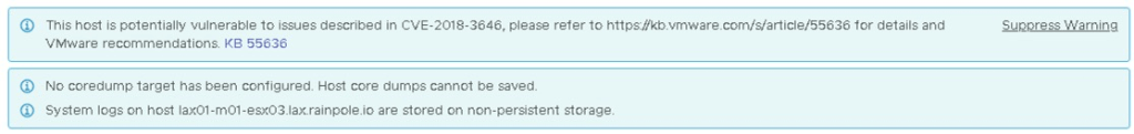 Issue 1 – A security vulnerability which involves a number of remediation steps to be performed – This host is potentially vulnerable to issues described in CVE-2018-3646, please refer to https://kb.vmware.com/s/article/55636 for details and VMware recommendations. KB 55636
