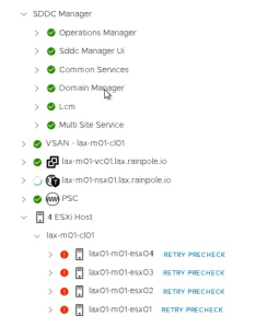 Whilst working on a few things this week I needed to upgrade my home lab running VMware Cloud Foundation, and was walking through the Upgrade Precheck when I hit a failure for the ESXi Config. During my investigation what I’ve found is that if there is any kind of warning that gets thrown in the Summary of the ESXi host then it will result in the Precheck failing on that host.