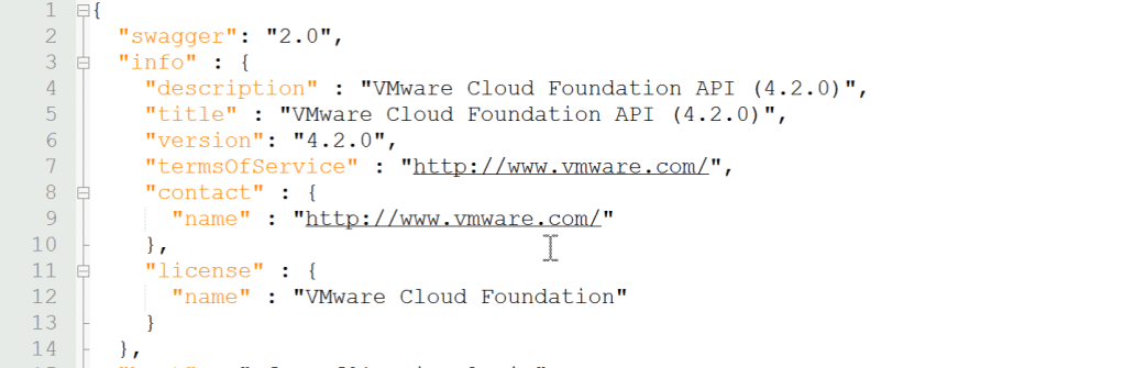 For VCF 4.2: The swagger.json file is located at /opt/vmware/vcf/sddc-manager-ui-app/client/dist/client/assets/spec For VCF 4.4: The swagger.json file is located at /opt/vmware/vcf/sddc-manager-ui-app/client/dist/client/assets/spec/external