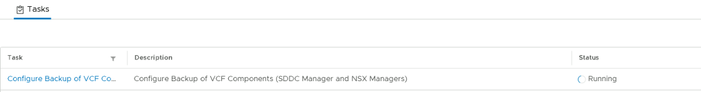 1. On the Confirm your changes to backup settings dialog, click Confirm. Your details will be saved and the Configure Backup of VCF Components (SDDC Manager and NSX Managers) task will start.