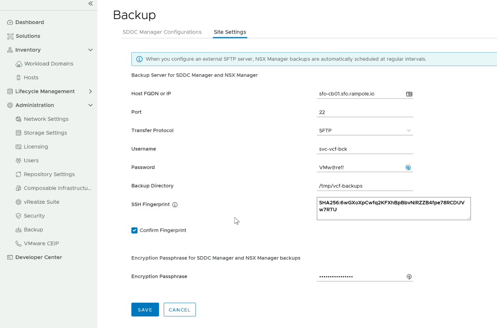 By default when VMware Cloud Foundation is deployed, SDDC Manager and NSX-T Data Center are configured to use an SFTP service running locally on the SDDC Manager Appliance. For production environments its critical that this is changed before going live to ensure that you have the ability to recover in the event of a disaster.