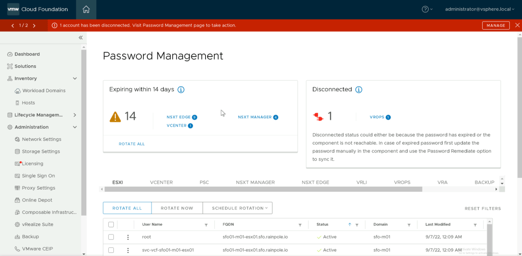 With the release of VMware Cloud Foundation 4.5.0 a welcome enhancement to Password Management comes the notification capability, with this new feature we have introduced firstly a new banner that appears in the SDDC Manager UI when an account is identified as disconnected either as a result of the password expiring or the component going offline and secondly a new widget that notifies you when passwords are due to expire.