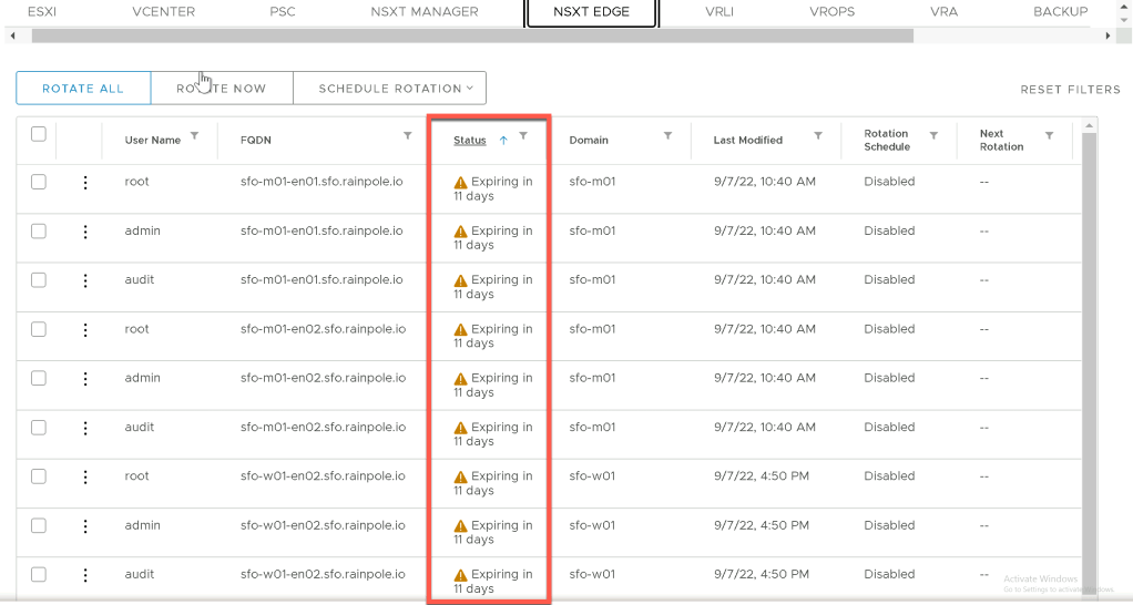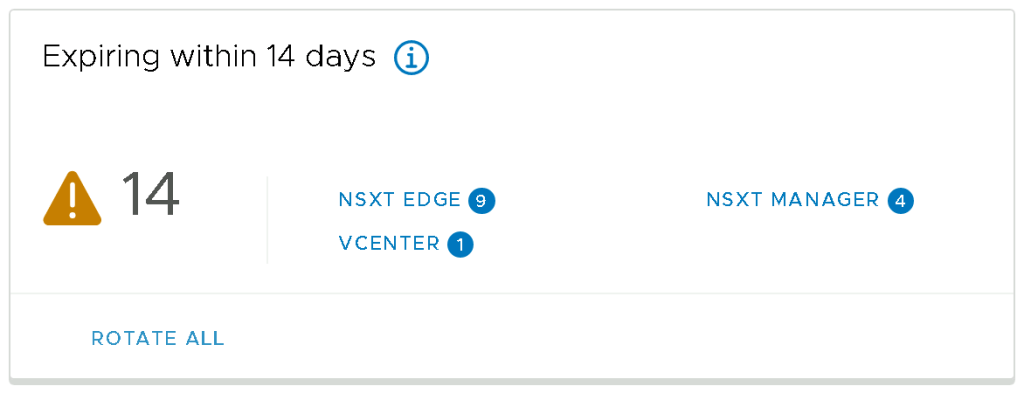 Let’s take a closer look at some of the details contained within the Expiring within 14 days widget in the SDDC Manager UI, in the image below you can see that we have 9 x NSX Edge and 4 x NSX Manager passwords that are flagged as expiring within the next 14 days.