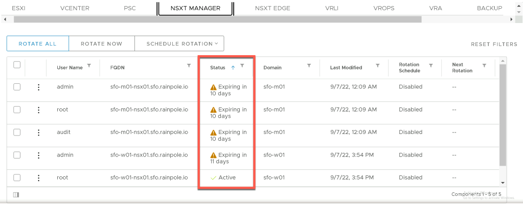 If we now take a closer look at the NSXT Manager and NSXT Edge component view under the Password Management section of the SDDC Manager UI we can see exactly which accounts and on which components are affected.