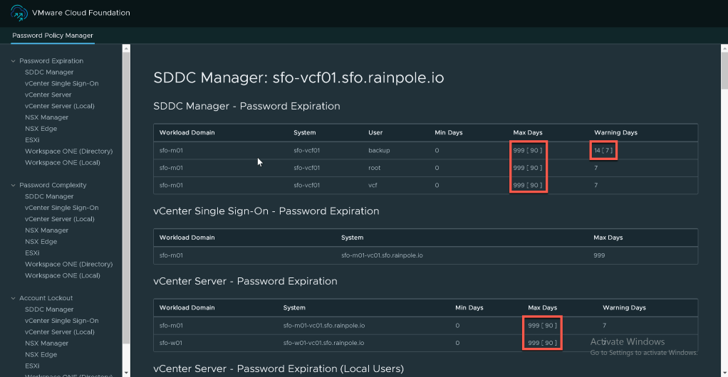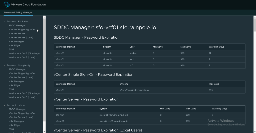 Using the Invoke-PasswordPolicyManager cmdlet contained within the PowerShell Module for VMware Cloud Foundation Password Management you can now easily generate a report to capture the current state configuration of all components across a VMware Cloud Foundation instance, and you can also compare the configuration against the desired state configuration to identify remediation work.