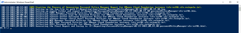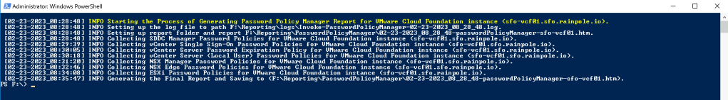 The Invoke-PasswordPolicyManager cmdlet is part of the PowerShell Module for VMware Cloud Foundation Password Management and provides the ability to generate two types of HTML reports: